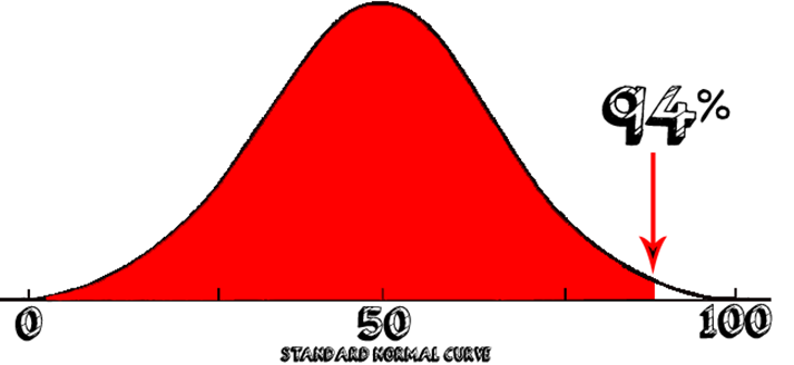 The score you have entered means that the individual who took the test is at the ninety-fourth percentile – their percentile rank is 94%. This means that the student had a test score greater than or equal to 94% of the reference population. Conversely, only 6% of students scored equal to or higher than the individual tested. For further information on how percentile ranks work, we recommend the MathIsFun page on Percentile Rank.