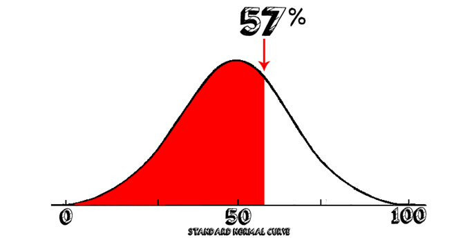 The score you have entered means that the individual who took the test is at the fifty-seventh percentile – their percentile rank is 57%. This means that the student had a test score greater than or equal to 57% of the reference population. Conversely, 43% of students scored equal to or higher than the individual tested. For further information on how percentile ranks work, we recommend the MathIsFun page on Percentile Rank.