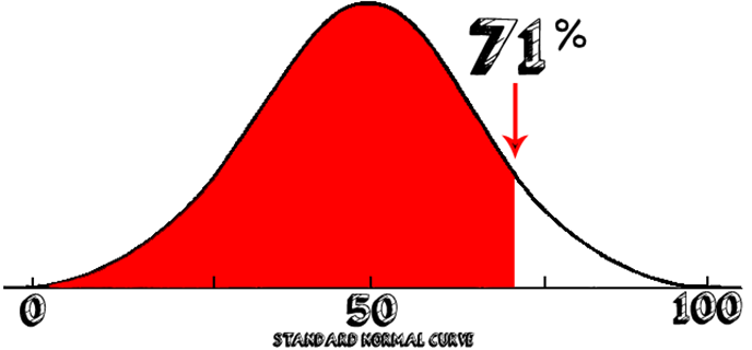 The score you have entered means that the individual who took the test is at the seventy-first percentile – their percentile rank is 71%. This means that the student had a test score greater than or equal to 71% of the reference population. Conversely, 29% of students scored equal to or higher than the individual tested. For further information on how percentile ranks work, we recommend the MathIsFun page on Percentile Rank.