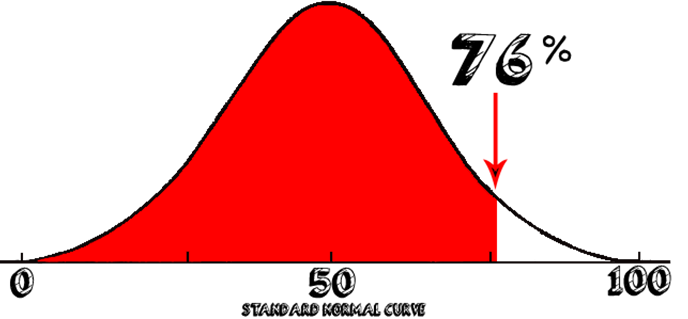 The score you have entered means that the individual who took the test is at the seventy-sixth percentile – their percentile rank is 76%. This means that the student had a test score greater than or equal to 76% of the reference population. Conversely, 24% of students scored equal to or higher than the individual tested. For further information on how percentile ranks work, we recommend the MathIsFun page on Percentile Rank.
